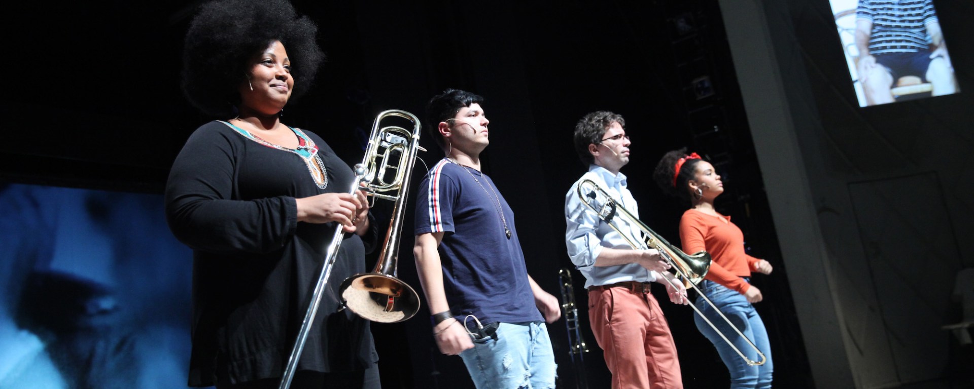 Aber auf Dauer fehlen dem Abend die performativ durchschlagenden Elemente. Nun ja, es gibt solche Augenblicke, etwa wenn die vier Erzählerinnen und Erzähler in ihre Posaunen pusten oder wenn sie Momente der Grosselterngeschichten mit kleinen Pappfigürchen in Miniszenen umsetzen, die dann auf die Grossleinwand projiziert werden. Es bleiben letztlich aber lediglich musikalische und multimediale Einsprengsel. Alles in allem bleibt das Projekt auf der Erzählebene stecken.