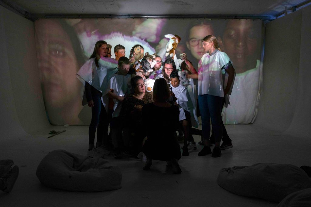Was für eine Energie diese Frau hat. Anderthalb Stunden fegt Bärbel Schwarz über die Vor- und, von einer Live-Kamera verfolgt, Hinterbühne im Keller des Theater Roxy. Sie kommuniziert mit dem Publikum, schlägt das Rad, sinniert über das Leben von Plüschtieren und das Wesen des Menschen (was nicht immer so gut zu unterscheiden ist), lässt sich von einem Kinderchor wegschleppen, taucht wieder auf, versucht den überlappenden Moment zwischen gefilmtem und physischem Auftritt zu erwischen …