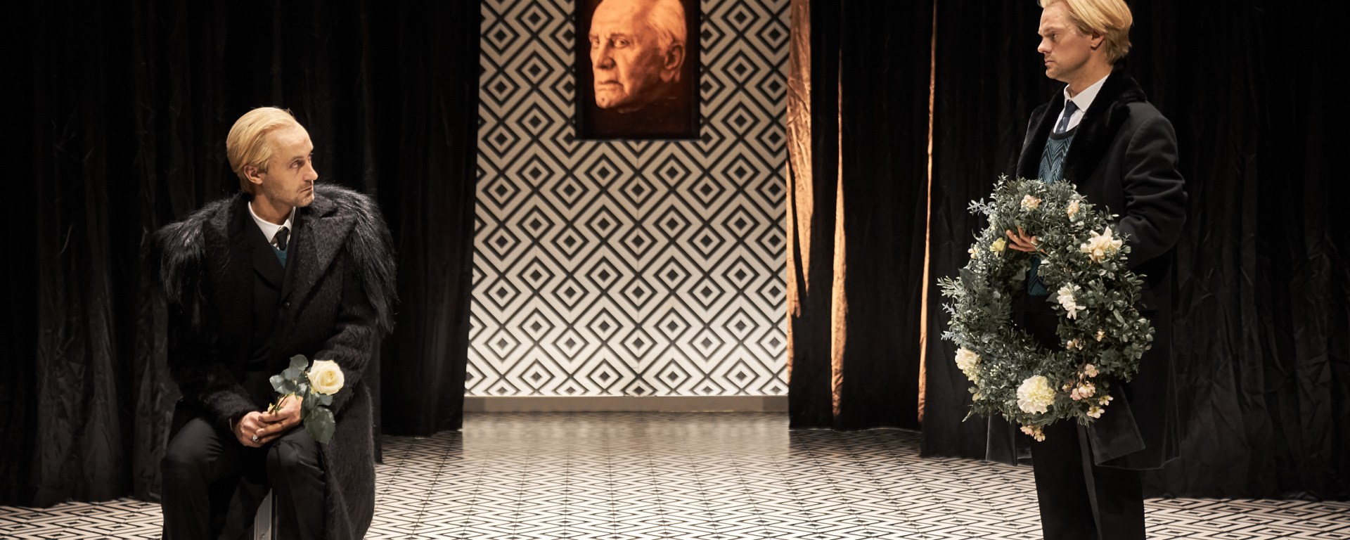 Die beiden Brüder treffen sich also zum ersten Mal am Sarg des Vaters. Der eine ist Musiker (Tuba) und Magier, der andere Rapper. Zwei höchst unterschiedliche Gesellen, auch wenn sie zumindest durch ihre blonden, streng nach hinten gekämmten Haare unzweideutig als Söhne ihres Vaters erkennbar sind. Dieser wiederum hängt als Porträt der Hollywood-Ikone Kirk Douglas, der Odysseus einst gemimt hatte, an der Hinterwand der Abdankungshalle (Bühne und Kostüme: Jennifer Jenkins und Matthias Koch).