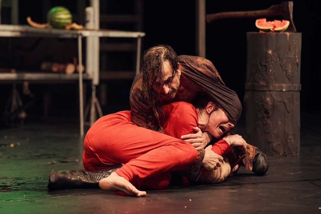 Trobisch hat dabei starke szenische Einfälle, die aber nie aufgesetzt wirken. Wenn Penthesilea und Achilles sich ihrer Liebe so wirklich bewusst werden, tritt Achilles‘ Begleiter Odysseus (Sven Schelker) in die Szene. Aus der Schlacht eilend, völlig deplatziert mit zwei abgehackten Köpfen von Amazonen in der Händen. Er tauscht sie im Kühlschrank gegen zwei Wassermelonen aus, die dann, von der Streitaxt zerstückelt, gemeinsam verspiesen werden. Und da ist, um es zu vollenden, auch noch Penthesileas Vertraute, Prothoe (Gala Othero Winter), die die Königin mit nachlassendem Elan zu mässigen versucht.