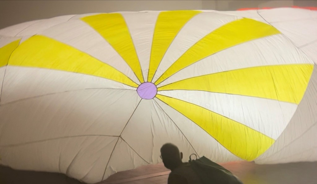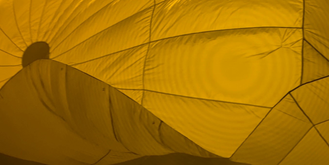 Das gelingt erst im x-ten Anlauf. Währenddessen gewinnt der in der Reithalle physisch hinterlegte Ballon langsam an Volumen, wird grösser und grösser, bis er zur Zelthalle für das Publikum wird. Eine Frauenstimme lullt die Menschen, die im Innern des Ballons Platz genommen haben, mit Aussagen über die Jahrmillionen dauernde Entstehung der Berge und das Abbröckeln derselben ein.