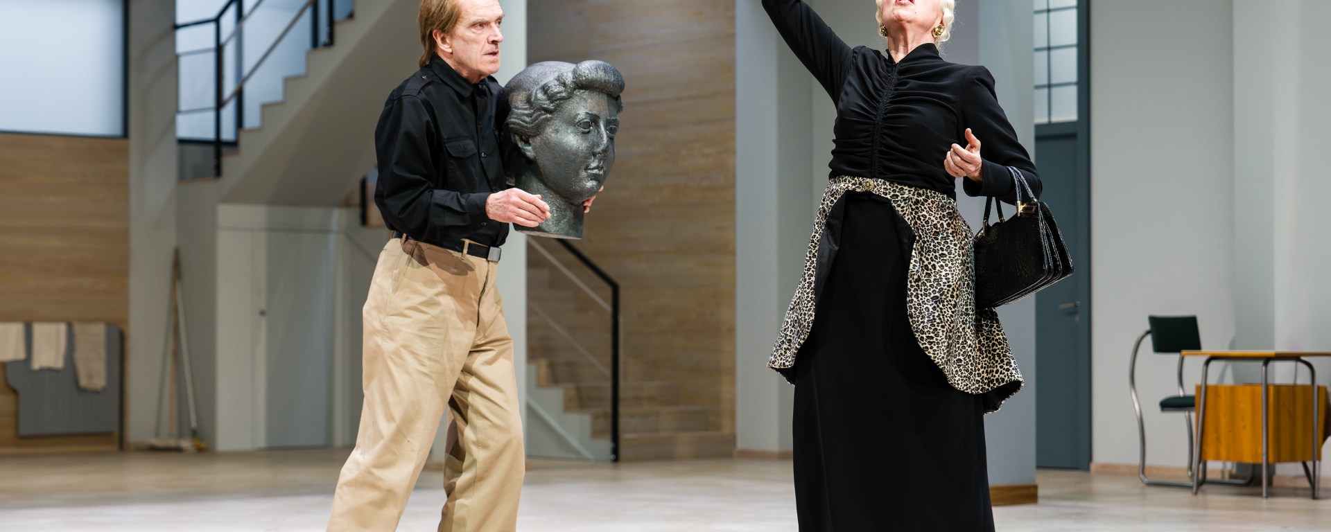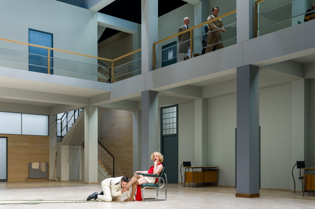 Stets spielt der Raum, also das Bühnenbild, eine tragende Rolle. Der mächtige, sachliche Raum der aktuellen Produktion erinnert an das offene Foyer eines Amts aus den 1940er-Jahren. Tatsächlich ist es ein Nachbau der „Casa del Fascio“ in Como, dem Faschistenhaus, das Marthalers Leib-Bühnenbildnerin Anna Viebrock minutiös kopiert und diagonal auf die Grosse Bühne des Theater Basel gestellt hat.