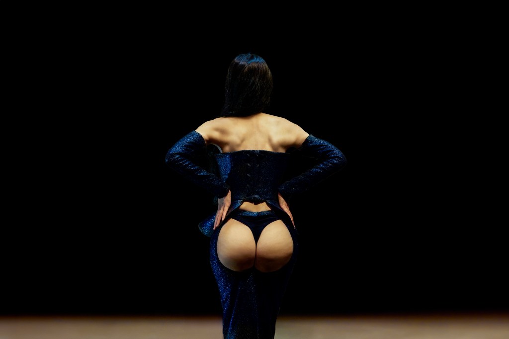 Aber zurück zu «Kim», so der Titel des Projekts, das Hadodo nicht nur spielt, sondern auch geschrieben und inszeniert hat. Eine Power-Frau für alles also. So wie Kim Kardashian ihr Leben über Instagram, TV-Soap und Tiktok selber inszeniert respektive als Projektion der Erwartungen ihrer 364 Millionen Follower inszenieren lässt. Als Konsumprodukt quasi, als eine Frau, die ihren perfektionierten Körper als postfeministisches Erfolgsmodul kredenzt und sich damit zur Milliardärin aufschwingt.