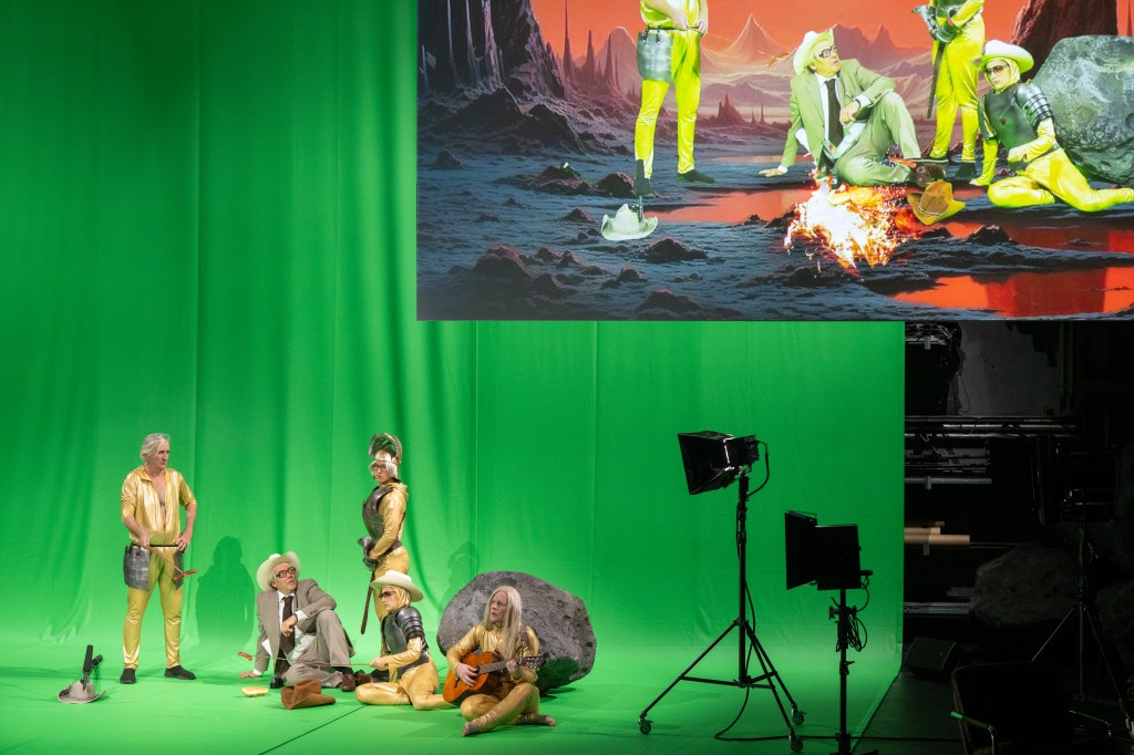 Auf der Bühnen begegnet man erst einmal Wesen in grünen Ganzkörperhüllen, welche die Raumschiffe in Form von Hotdogs durch die Luft schweben lassen. Die Greenscreen-Technik erlaubt es auch, die Marsianerinnen auf der grossen Leinwand als körperlose und die Gesichter reduzierte Erscheinungen auftreten lassen. Die Raumfahrer wiederum sind mit mittelalterlichen Ritterrüstungen bestückt.