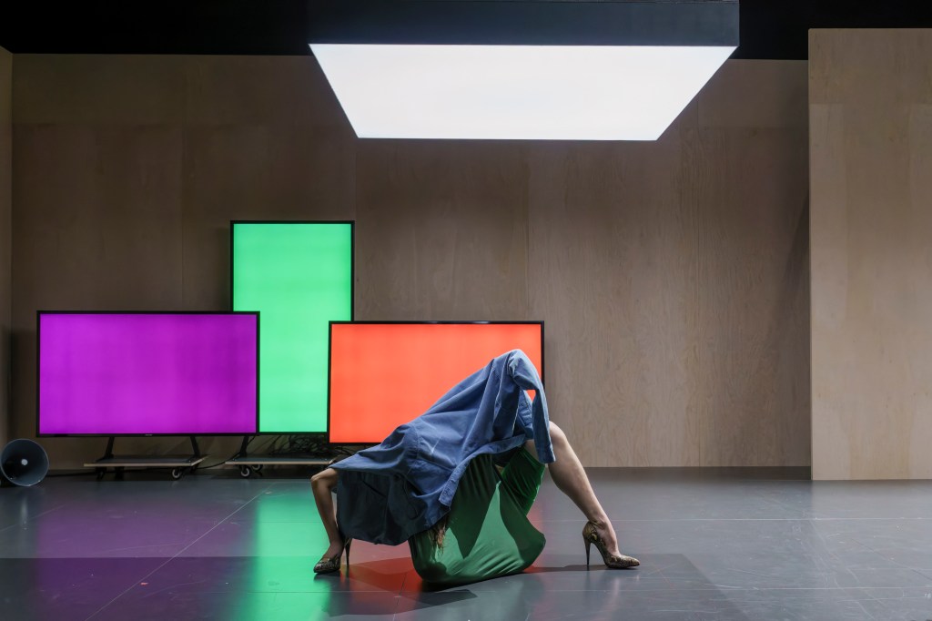Ich hab mich nach der Pause wieder an meinen Platz gesetzt. Dies in der Hoffnung, dass ich und alle anderen im Zuschauerraum der Kleinen Bühne nach einer langen halben Stunde mit Hampeln, Fallen, Kriechen, Verrenken, Krächzen (und auch mal singen) mit einem zweiten Teil belohnt wird, der mehr ist als ein Aneinanderreihen von zusammenhangslosen Bühnenmomenten. Musikalisch begleitet wird das Ganze von Musikstücken, die zwischen Streicher-Adagio, Smooth und Free Jazz sowie New Wave mäandrieren, während auf drei Bildschirmen unter anderem Szenen aus der Seitenbühne eingespielt werden bis auf einem der Screens gross der Schriftzug „Pause“ zu lesen ist.