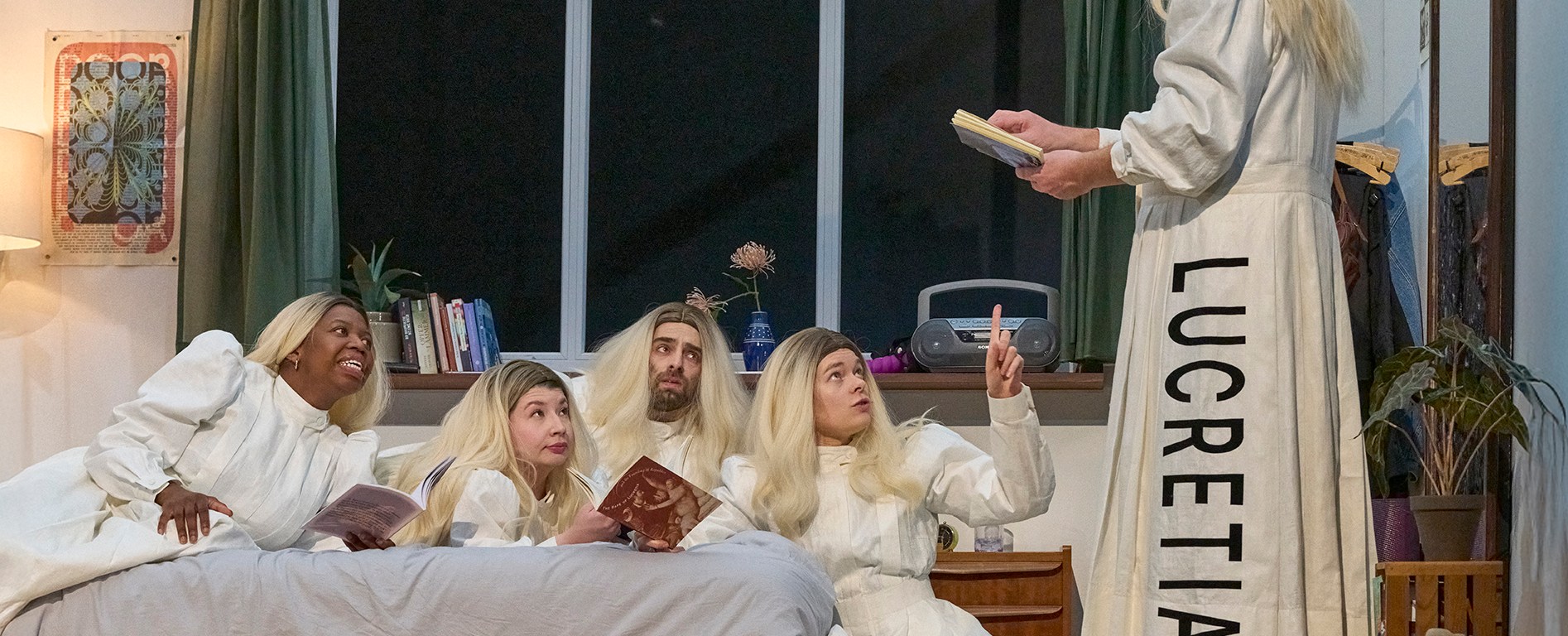 Das alles mag in dieser Beschreibung vielleicht etwas wirr erscheinen, aber Regisseurin Arias und das Ensemble verweben das sprunghaft wechselnde Geschehen in ein sich szenisch und inhaltlich stimmig zusammenfügendes Ganzes.