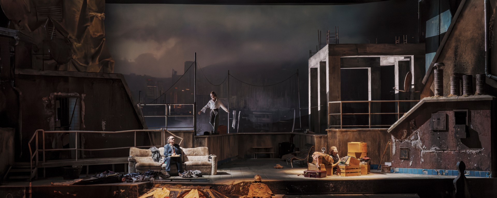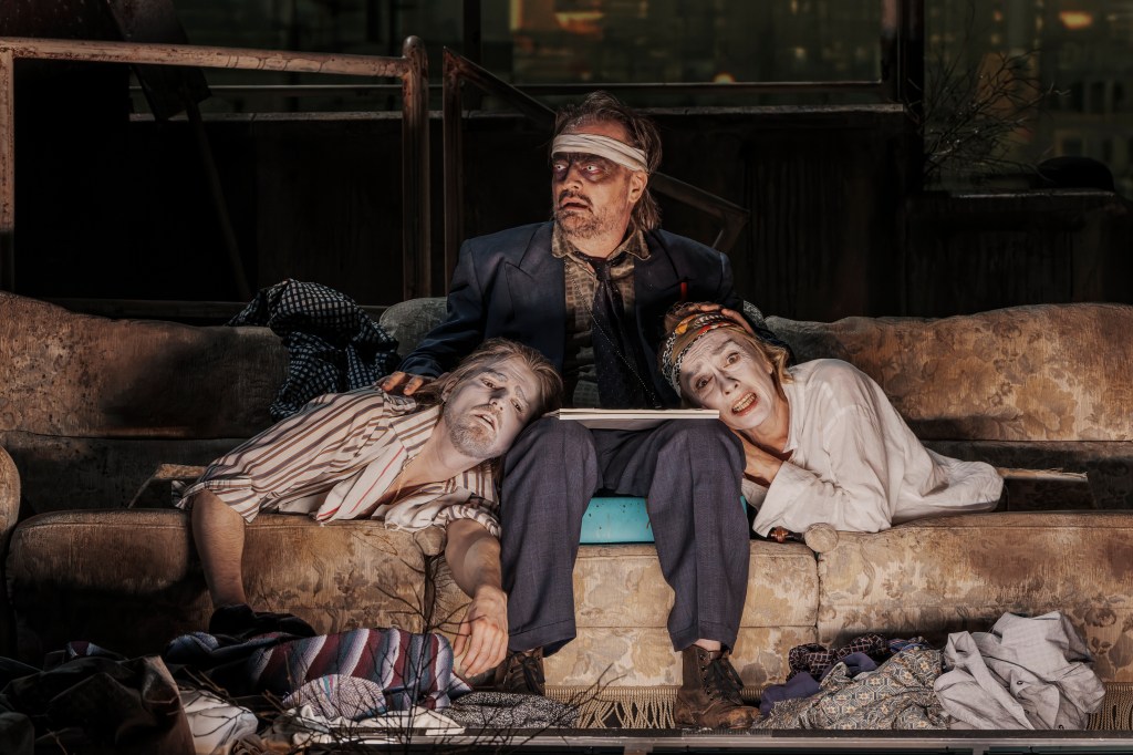 Regisseur David Marton hat die von Beckett in einer Art Schutzraum verbannte Szenerie auf eine verfallene Dachlandschaft versetzt, hinter der die Skyline einer offenbar ausgestorbenen Stadt zu erblicken ist. Nall und Negg vagabundieren nicht in Mülleimern, sondern wachsen aus den Sitzflächen des Sofas empor, auf dem Hamm gefangen ist. Es ist ein Bühnenbild (Márton Ágh), das im Detail zu betrachten alleine schon den Gang ins Theater lohnt. Und man hat viel Zeit dazu, denn Actionmomente gibt es an diesem Abend nicht.
